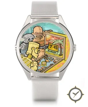 Eine Digital-Uhr mit einem vielseitigen 38mm Gehäuse, das an fast jedes Handgelenk passt, gefertigt aus Edelstahl mit einem Zifferblatt in türkis und einer besonderen "printed-illustration"-Oberfläche.