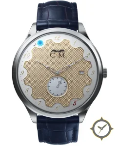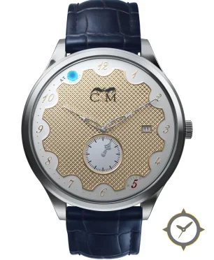 Eine Dress-Uhr mit einem markanten 47mm Auftritt am Handgelenk, gefertigt aus Edelstahl mit einem Zifferblatt in gold und einer besonderen "guilloché / waffle (textured)"-Oberfläche.