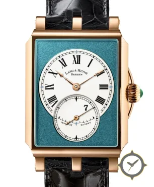 Eine Dress-Uhr mit einem vielseitigen 39.5mm Gehäuse, das an fast jedes Handgelenk passt, gefertigt aus Gold mit einem Zifferblatt in türkis und einer besonderen "frosted / sandblasted finish"-Oberfläche.