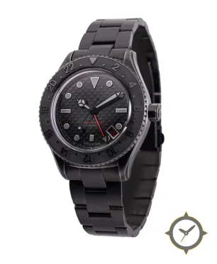 Eine GMT-Uhr mit einem markanten 44mm Auftritt am Handgelenk, gefertigt aus Edelstahl mit einem Zifferblatt in schwarz und einer besonderen "carbon fiber"-Oberfläche und einer echten GMT-Funktion, mit der du eine zweite Zeitzone verfolgen kannst.