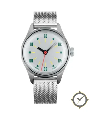 Eine Minimalistisch-Uhr mit einem vielseitigen 40.5mm Gehäuse, das an fast jedes Handgelenk passt, gefertigt aus Edelstahl mit einem Zifferblatt in silber und einer besonderen "radial brushed"-Oberfläche.