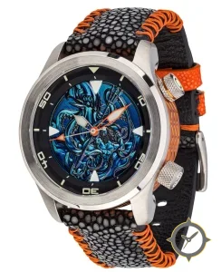 Eine Taucheruhr-Uhr mit einem 36.5mm Gehäuse im Vintage-Stil gefertigt aus Edelstahl mit einem Zifferblatt in blau und einer besonderen "embossed/relief (sculpted octopus)"-Oberfläche.