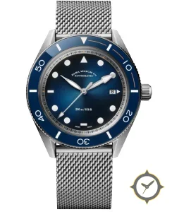 Eine Taucheruhr-Uhr mit einem 34.5mm Gehäuse im Vintage-Stil gefertigt aus Edelstahl mit einem Zifferblatt in blau und einer besonderen "sunburst"-Oberfläche.