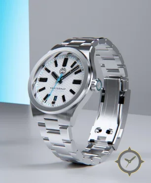 Eine Sport-Uhr mit einem markanten 43.5mm Auftritt am Handgelenk, gefertigt aus Edelstahl mit einem Zifferblatt in weiß und einer besonderen "textured waffle / guilloché"-Oberfläche.