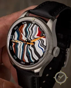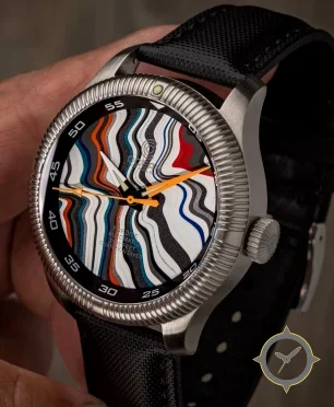 Eine Taucheruhr-Uhr mit einem vielseitigen 38.5mm Gehäuse, das an fast jedes Handgelenk passt, gefertigt aus Edelstahl mit einem Zifferblatt in schwarz und einer besonderen "layered, swirled/marbled multicolour resin with high-contrast printed chapter ring"-Oberfläche.