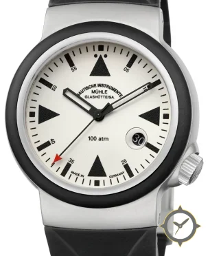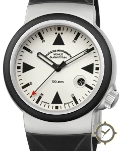 Eine Taucheruhr-Uhr mit einem markanten 49mm Auftritt am Handgelenk, gefertigt aus Edelstahl mit einem Zifferblatt in weiß und einer besonderen "matte"-Oberfläche.