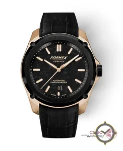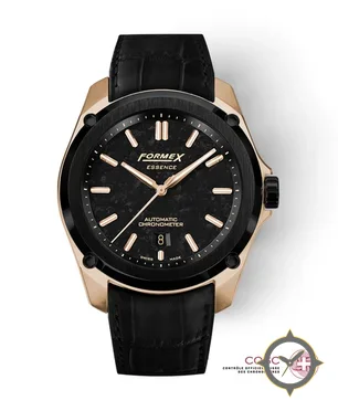 Eine Luxus-Uhr mit einem vielseitigen 39mm Gehäuse, das an fast jedes Handgelenk passt, gefertigt aus Gold mit einem Zifferblatt in schwarz und einer besonderen "marbled/stone-like texture"-Oberfläche.