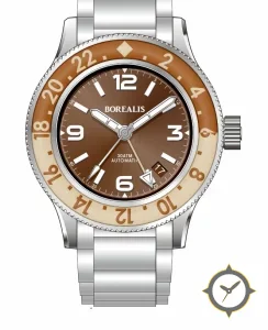 Eine GMT-Uhr mit einem markanten 49mm Auftritt am Handgelenk, gefertigt aus Edelstahl mit einem Zifferblatt in braun und einer besonderen "sunburst"-Oberfläche und einer echten GMT-Funktion, mit der du eine zweite Zeitzone verfolgen kannst.