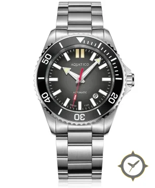 Eine Taucheruhr-Uhr mit einem markanten 48mm Auftritt am Handgelenk, gefertigt aus Edelstahl mit einem Zifferblatt in grau und einer besonderen "matte sunburst / gradient"-Oberfläche.