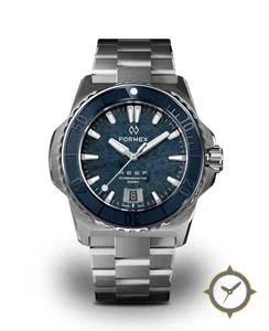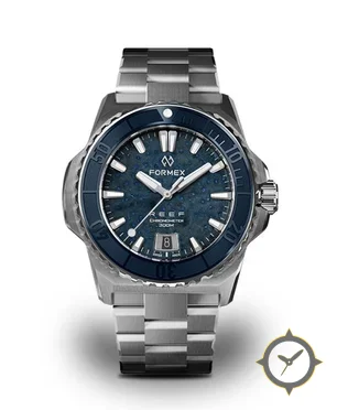 Eine Taucheruhr-Uhr mit einem markanten 45mm Auftritt am Handgelenk, gefertigt aus Edelstahl mit einem Zifferblatt in blau und einer besonderen "textured/marbled (stone-like)"-Oberfläche.