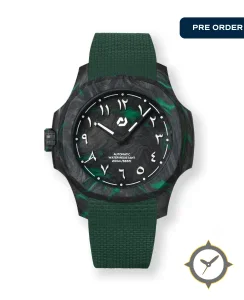 Eine Taucheruhr-Uhr mit einem markanten 43mm Auftritt am Handgelenk, gefertigt aus Carbon mit einem Zifferblatt in schwarz und einer besonderen "marbled/carbon-fiber"-Oberfläche.