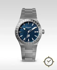 Eine Sport-Uhr mit einem vielseitigen 39mm Gehäuse, das an fast jedes Handgelenk passt, gefertigt aus Edelstahl mit einem Zifferblatt in blau und einer besonderen "embossed scale/diamond guilloché texture"-Oberfläche.