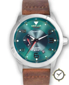 Eine Pilot-Uhr mit einem markanten 49mm Auftritt am Handgelenk, gefertigt aus Edelstahl mit einem Zifferblatt in türkis und einer besonderen "sunburst / radial brushed finish"-Oberfläche.
