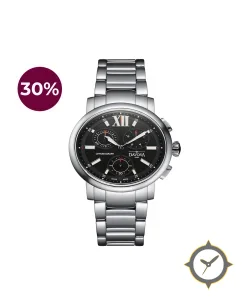 Eine Chronograph-Uhr mit einem 34.5mm Gehäuse im Vintage-Stil gefertigt aus Edelstahl mit einem Zifferblatt in schwarz und einer besonderen "matte"-Oberfläche.