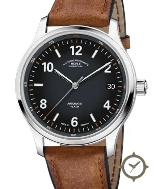 Eine Pilot-Uhr mit einem markanten 49.5mm Auftritt am Handgelenk, gefertigt aus Edelstahl mit einem Zifferblatt in schwarz und einer besonderen "matte with slight gradient"-Oberfläche.