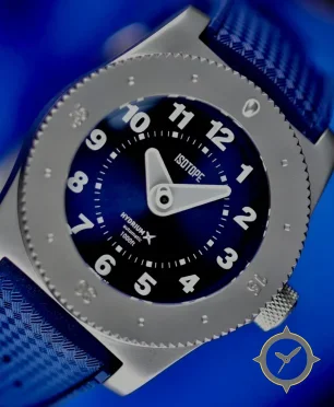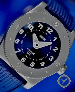 Eine Taucheruhr-Uhr mit einem 32.5mm Gehäuse im Vintage-Stil gefertigt aus Edelstahl mit einem Zifferblatt in blau und einer besonderen "sunburst"-Oberfläche.