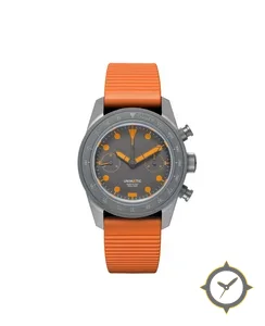 Eine Chronograph-Uhr mit einem markanten 47mm Auftritt am Handgelenk, gefertigt aus Edelstahl mit einem Zifferblatt in grau und einer besonderen "matte sandblasted"-Oberfläche.