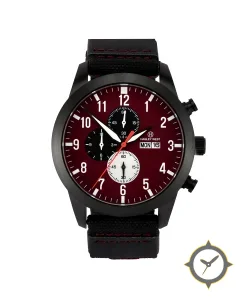 Eine Chronograph-Uhr mit einem markanten 52.5mm Auftritt am Handgelenk, gefertigt aus Edelstahl mit einem Zifferblatt in rot und einer besonderen "matte"-Oberfläche.
