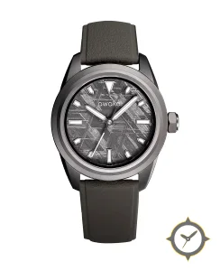 Eine Tool-Uhr mit einem markanten 41.5mm Auftritt am Handgelenk, gefertigt aus Titan mit einem Zifferblatt in grau und einer besonderen "meteorite-style metallic texture"-Oberfläche.
