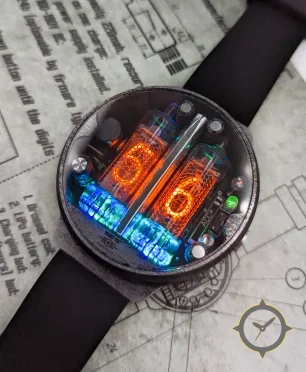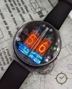 Eine Digital-Uhr mit einem markanten 46mm Auftritt am Handgelenk, gefertigt aus Edelstahl mit einem Zifferblatt in schwarz und einer besonderen "exposed circuitry and components with illuminated Nixie tubes under a domed crystal"-Oberfläche.