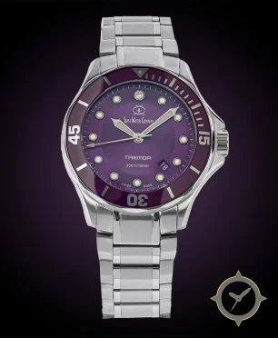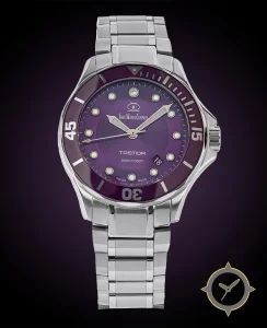 Eine Taucheruhr-Uhr mit einem vielseitigen 39.5mm Gehäuse, das an fast jedes Handgelenk passt, gefertigt aus Edelstahl mit einem Zifferblatt in lila und einer besonderen "sunburst"-Oberfläche.