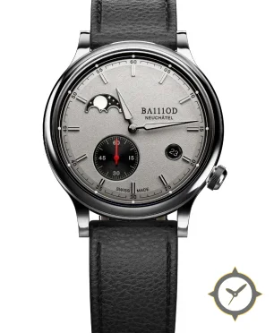 Eine Dress-Uhr mit einem vielseitigen 39mm Gehäuse, das an fast jedes Handgelenk passt, gefertigt aus Edelstahl mit einem Zifferblatt in silber und einer besonderen "frosted/grainy matte"-Oberfläche und einer wunderschönen Mondphasenanzeige.
