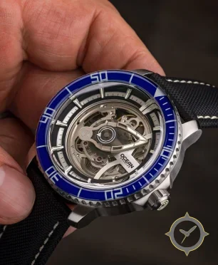 Eine Taucheruhr-Uhr mit einem markanten 47mm Auftritt am Handgelenk, gefertigt aus Edelstahl mit einem Zifferblatt in silber und einer besonderen "skeleton / open-work (visible movement)"-Oberfläche.