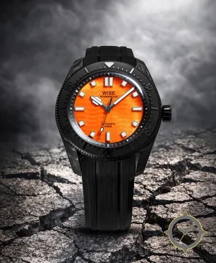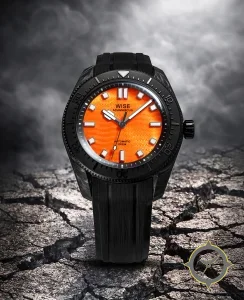 Eine Taucheruhr-Uhr mit einem vielseitigen 41mm Gehäuse, das an fast jedes Handgelenk passt, gefertigt aus Carbon mit einem Zifferblatt in orange und einer besonderen "damascus-textured"-Oberfläche.