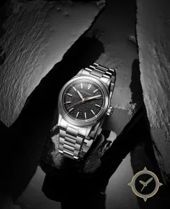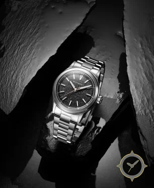 Eine Sport-Uhr mit einem vielseitigen 41mm Gehäuse, das an fast jedes Handgelenk passt, gefertigt aus Edelstahl mit einem Zifferblatt in schwarz und einer besonderen "granular / aventurine-like sparkling texture"-Oberfläche.