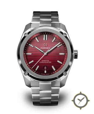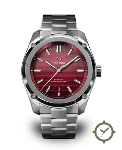 Eine Sport-Uhr mit einem markanten 47mm Auftritt am Handgelenk, gefertigt aus Edelstahl mit einem Zifferblatt in karmesinrot und einer besonderen "horizontal engraved lines"-Oberfläche.