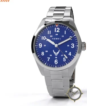 Eine Pilot-Uhr mit einem markanten 42.5mm Auftritt am Handgelenk, gefertigt aus Edelstahl mit einem Zifferblatt in blau und einer besonderen "sunburst metallic"-Oberfläche.