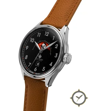 Eine Vintage-Uhr mit einem markanten 43.5mm Auftritt am Handgelenk, gefertigt aus Edelstahl mit einem Zifferblatt in schwarz und einer besonderen "glossy lacquer"-Oberfläche und einer praktischen Gangreserveanzeige.