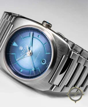 Eine Sport-Uhr mit einem 37.5mm Gehäuse im Vintage-Stil gefertigt aus Edelstahl mit einem Zifferblatt in blau und einer besonderen "sunburst (radial brushed)"-Oberfläche.