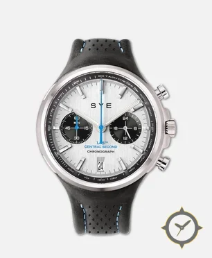 Eine Chronograph-Uhr mit einem markanten 48mm Auftritt am Handgelenk, gefertigt aus Edelstahl mit einem Zifferblatt in silber und einer besonderen "brushed"-Oberfläche.