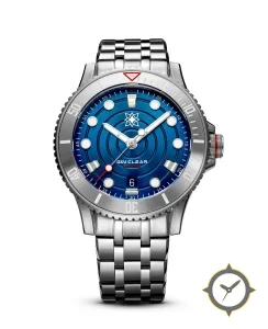 Eine Taucheruhr-Uhr mit einem markanten 47.5mm Auftritt am Handgelenk, gefertigt aus Edelstahl mit einem Zifferblatt in blau und einer besonderen "concentric rings"-Oberfläche.