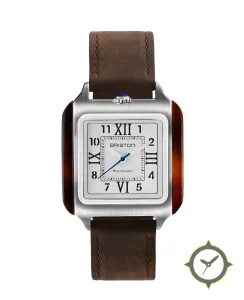 Eine Dress-Uhr mit einem 30mm Gehäuse im Vintage-Stil gefertigt aus Edelstahl mit einem Zifferblatt in weiß und einer besonderen "matte outer with guilloche-finished square center"-Oberfläche.