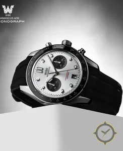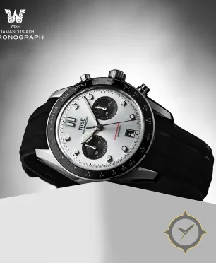 Eine Chronograph-Uhr mit einem 32.5mm Gehäuse im Vintage-Stil gefertigt aus Edelstahl mit einem Zifferblatt in weiß und einer besonderen "mother-of-pearl / pearlescent finish"-Oberfläche.