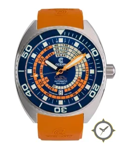 Eine Taucheruhr-Uhr mit einem markanten 48.5mm Auftritt am Handgelenk, gefertigt aus Edelstahl mit einem Zifferblatt in blau und einer besonderen "matte"-Oberfläche.