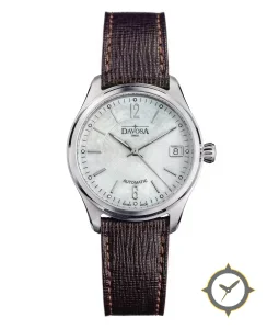 Eine Dress-Uhr mit einem 32.5mm Gehäuse im Vintage-Stil gefertigt aus Edelstahl mit einem Zifferblatt in weiß und einer besonderen "mother-of-pearl with concentric guilloché center"-Oberfläche.