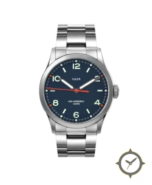 Eine Field-Uhr mit einem 32mm Gehäuse im Vintage-Stil gefertigt aus Edelstahl mit einem Zifferblatt in marineblau und einer besonderen "matte"-Oberfläche.