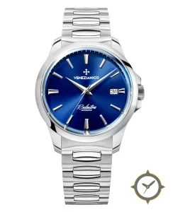 Eine Dress-Uhr mit einem vielseitigen 38.5mm Gehäuse, das an fast jedes Handgelenk passt, gefertigt aus Edelstahl mit einem Zifferblatt in blau und einer besonderen "sunburst"-Oberfläche.