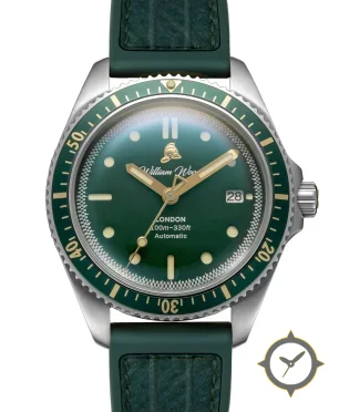 Eine Taucheruhr-Uhr mit einem 36.5mm Gehäuse im Vintage-Stil gefertigt aus Edelstahl mit einem Zifferblatt in grün und einer besonderen "glossy sunburst"-Oberfläche.