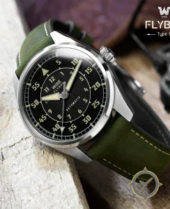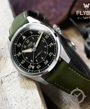 Eine Pilot-Uhr mit einem 32mm Gehäuse im Vintage-Stil gefertigt aus Edelstahl mit einem Zifferblatt in schwarz und einer besonderen "matte grained / brushed"-Oberfläche.