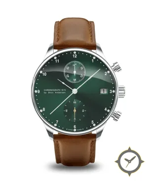 Eine Chronograph-Uhr mit einem markanten 44.5mm Auftritt am Handgelenk, gefertigt aus Edelstahl mit einem Zifferblatt in grün und einer besonderen "sunburst"-Oberfläche.