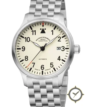 Eine Pilot-Uhr mit einem markanten 43.5mm Auftritt am Handgelenk, gefertigt aus Edelstahl mit einem Zifferblatt in weiß und einer besonderen "matte"-Oberfläche.