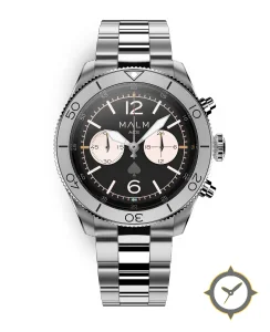 Eine Chronograph-Uhr mit einem markanten 51.5mm Auftritt am Handgelenk, gefertigt aus Edelstahl mit einem Zifferblatt in schwarz und einer besonderen "matte"-Oberfläche.