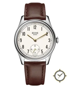 Eine Dress-Uhr mit einem 34.5mm Gehäuse im Vintage-Stil gefertigt aus Edelstahl mit einem Zifferblatt in weiß und einer besonderen "matte"-Oberfläche.