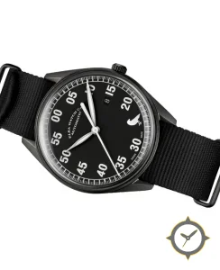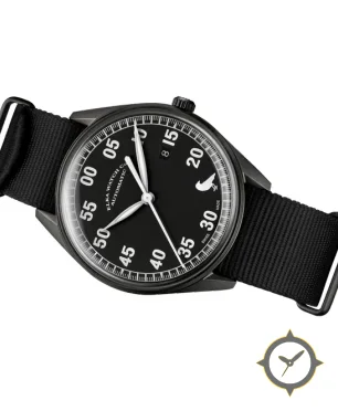 A Pilot watch with a vintage-inspired 37.5mm case, crafted from stainless steel featuring a black dial with a unique matte finish.