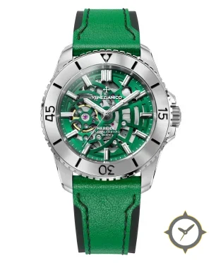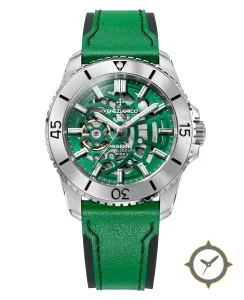 A Dive watch with a vintage-inspired 35mm case, crafted from stainless steel featuring a green dial with a unique skeletonized / open-worked showing movement finish.
