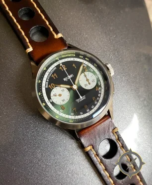 A Chronograph watch with a bold 48mm presence on the wrist, crafted from stainless steel featuring a green dial with a unique sunburst finish.